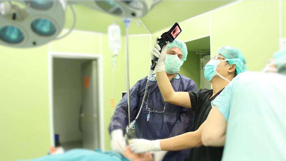 盡管,我們會(huì)在插管前進(jìn)行評(píng)估,但是解剖學(xué)和生理上的插管困難是無法預(yù)知的。因此,為了對(duì)意外出現(xiàn)的困難插管做好準(zhǔn)備,我們以標(biāo)準(zhǔn)化的方式完成所有插管。我們確保急救裝置(口咽導(dǎo)氣管、鼻咽氣道、探針、喉罩(LMA)、環(huán)甲膜切開裝置)、去氧腎上腺素、并且可以立即經(jīng)靜脈輸入晶體液。由兩名醫(yī)護(hù)人員參與氣管插管,主要操作者站在床頭,另一個(gè)則站在病人的左側(cè)。主要操作者負(fù)責(zé)在插管前給與充足的預(yù)氧合、開放氣道、選擇藥物、檢查喉鏡以及氣管內(nèi)置管。如果進(jìn)行面罩通氣,則由主要操作者負(fù)責(zé)患者的面罩密封,另一個(gè)人負(fù)責(zé)監(jiān)測(cè)患者生命體征、移交插管的主要設(shè)備、在操作者插管時(shí)固定喉鏡位置以及在雙人面罩通氣時(shí)負(fù)責(zé)送氣。我們假設(shè)—一旦由團(tuán)隊(duì)中最有經(jīng)驗(yàn)的醫(yī)生經(jīng)最大的努力后(包括氣管插管,LMA,面罩通氣)仍未插管成功,尤其時(shí)在罕見的“不能插管、不能供氧”的情況下,團(tuán)隊(duì)必須快速采用另一種環(huán)甲軟骨切開術(shù)。